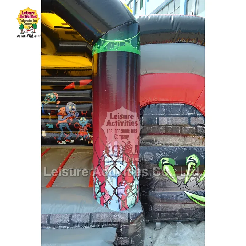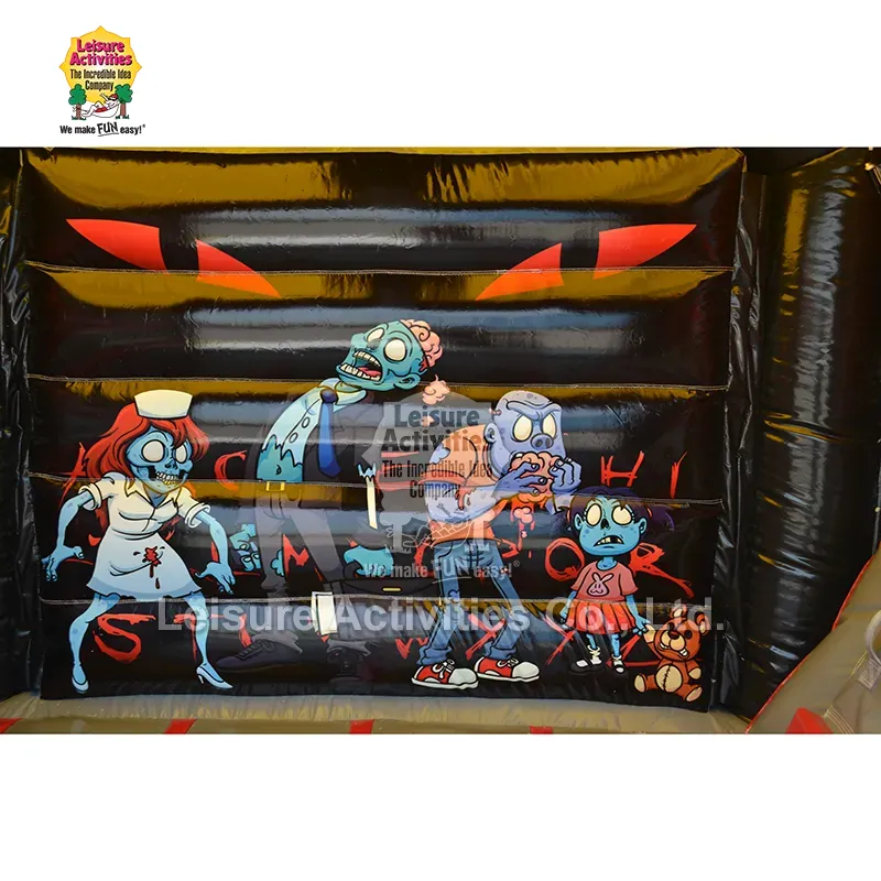 Kastil Bouncy Multiplay Inflatable Cilik sing Angker karo Geser: Inflatable "Kombo Angker" Zombie iki dirancang kanggo nggumunake bocah-bocah kanthi estetika kartun-medeni sing nyenengake. Kombinasi kandel saka abang kandel, ireng nggilap, lan ijo lan biru sing nyenengake nggawe lingkungan sing nyenengake lan nyenengake. Grafis kartun zombie sing gedhe lan lucu ing pose dinamis-kaya perawat, karakter sing mangan otak, lan bocah zombie sing duwe boneka teddy-luwih nyenengake tinimbang medeni. Elemen interaktif kaya zombie biru gedhe sing nyusup ing atap, tangan cakar njeblug ing tembok, lan rante/grafis ing kolom sing ndadekake dolanan imajinatif. Struktur terlampir karo tutup ndhuwur protèktif menehi iyub-iyub lan pangayoman udan cahya, nalika geser terlampir nambah kanggo ngulandara. Dhuwur 10ft ndadekake serba guna kanggo panggunaan njero ruangan lan ruangan, pesta Halloween sing pas, festival musim gugur, acara ulang tahun kanthi tema, lan nyenengake latar mburi.